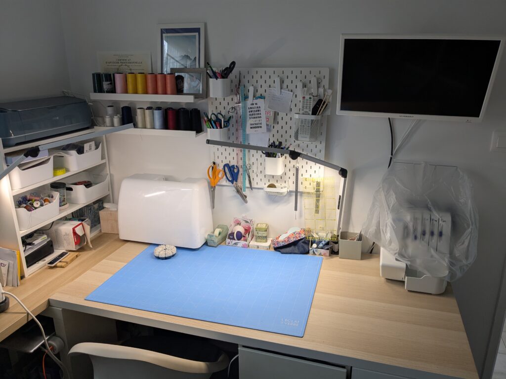 Je suis installée chez moi, dans la chambre de ma grande fille partiellement transformée en atelier! Je me suis équipée en matériel au fur et à mesure de la formation pour mon CAP, ce qui me permet d’être bien installée pour créer à mon rythme à l’heure actuelle.